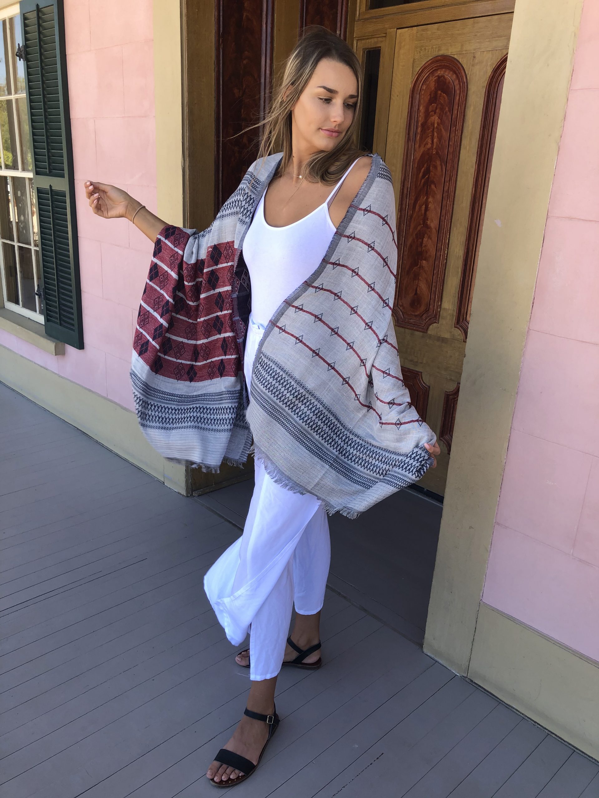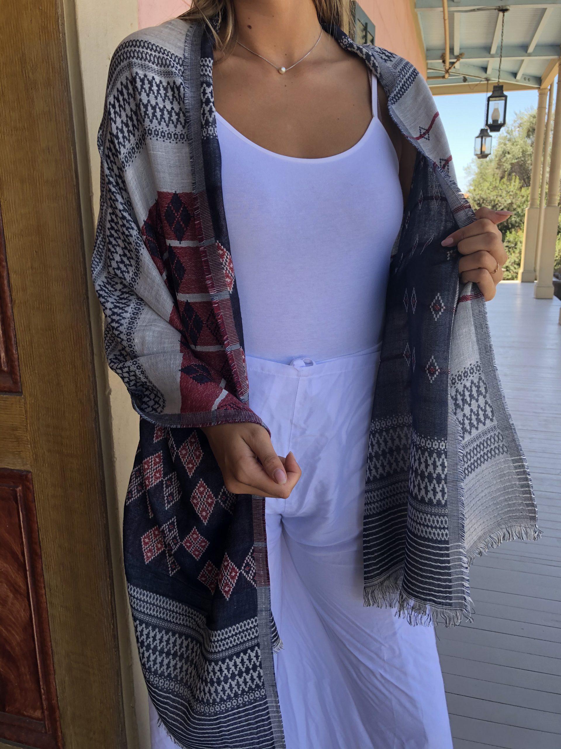 Kick up your style a notch with this gorgeous handcrafted geometric fringe cotton scarf. Can also be worn as a shawl.